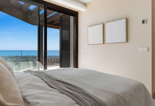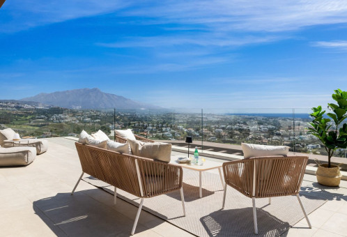 This stunning, newly built detached villa is located in a prime corner position, facing east/southeast, and offers a private garden, pool, and underfloor heating throughout the main floors and bathrooms. The property boasts spectacular sea and mountain views in Benahavís, situated within a secure, gated complex of just 13 villas. Within a short 10-20 minute drive, you can access some of the best golf courses on the Costa del Sol. The 'Pueblo Blanco de Benahavís,' known for its variety of restaurants, cafes, bars, and a supermarket, is just 10 minutes away, while the renowned Puerto Banús marina, with its wide beaches, beach clubs, restaurants, and luxury boutiques, is only 16 minutes by car. The villa spans two main floors, plus a basement and a rooftop terrace, offering a total of four bedrooms, three bathrooms (two of which are en-suite), and a guest toilet. On the ground floor, you'll find a spacious open-plan living and dining area with an integrated kitchen and guest toilet. This area leads directly onto the terrace and private garden, which features an outdoor dining space and a pool. The upper floor includes a master bedroom with a dressing room and en-suite bathroom, as well as two additional bedrooms that share a family bathroom. Each bedroom has access to a terrace with stunning views. The rooftop terrace offers breathtaking and unobstructed panoramic views of the sea and the surrounding mountains. The 100 m² basement features a large 56 m² open space, ideal for a home cinema, hobby room, or other uses, along with a fourth bedroom with an en-suite bathroom, a machine room, and storage. Additional features of this villa include air conditioning (hot and cold) throughout, brand-new furniture included in the price, and impressive views of La Concha mountain, the coastline, and the Mediterranean Sea. The property is available immediately, making it an excellent opportunity to acquire a fully furnished, modern villa with spectacular sea views in a highly sought-after area of the Costa del Sol.