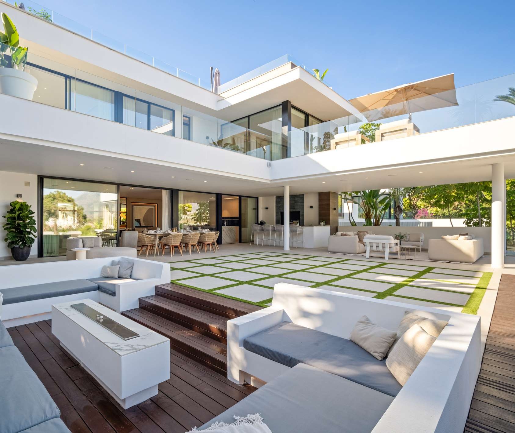 Villa Layla is an exceptional brand-new luxury residence located in the prestigious Golf Valley of Nueva Andalucía, Marbella. This stunning contemporary villa offers spectacular views of La Concha mountain and is positioned just moments from the renowned Las Brisas Golf Club. The property represents the pinnacle of modern Mediterranean living, with meticulous attention to detail throughout. Spanning three levels, Villa Layla features five luxurious bedroom suites, each with its own en-suite bathroom, providing ultimate comfort and privacy. The main floor showcases an expansive open-plan living and dining area that flows seamlessly onto generous terraces, creating an ideal space for both relaxation and entertaining. The fully equipped designer kitchen meets the highest standards with premium appliances and elegant finishes. The outdoor spaces are truly exceptional, featuring an infinity pool overlooking the golf course and mountains, a rooftop jacuzzi with panoramic views, and beautifully landscaped gardens. Additional highlights include a private gym, cinema room, wine cellar, and a two-car garage. With its prime location, world-class finishes, and thoughtful design, Villa Layla offers an unparalleled lifestyle in one of Marbella's most sought-after addresses.